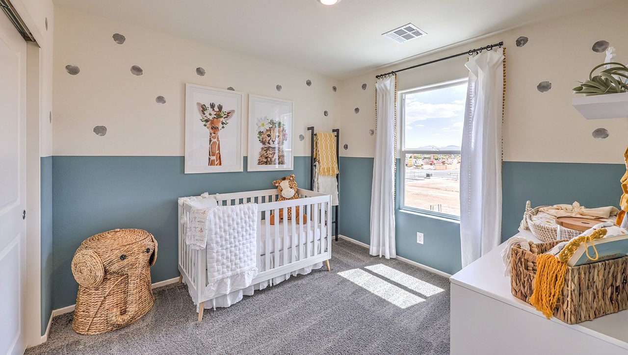 - The nursery features a white crib, playful animal artwork, and soft gray carpet for a cozy feel.
