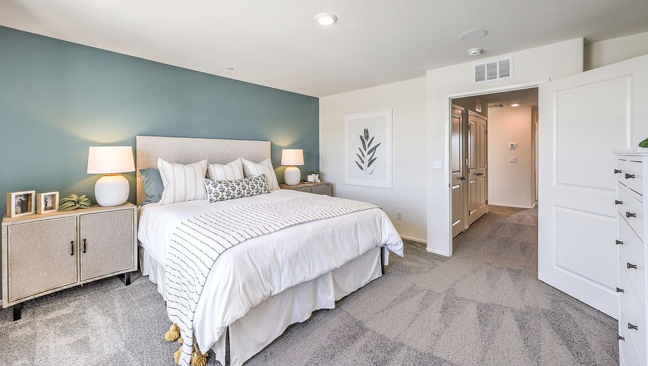 - The bedroom features a teal accent wall, light bedding, and neutral furniture for a serene atmosphere.